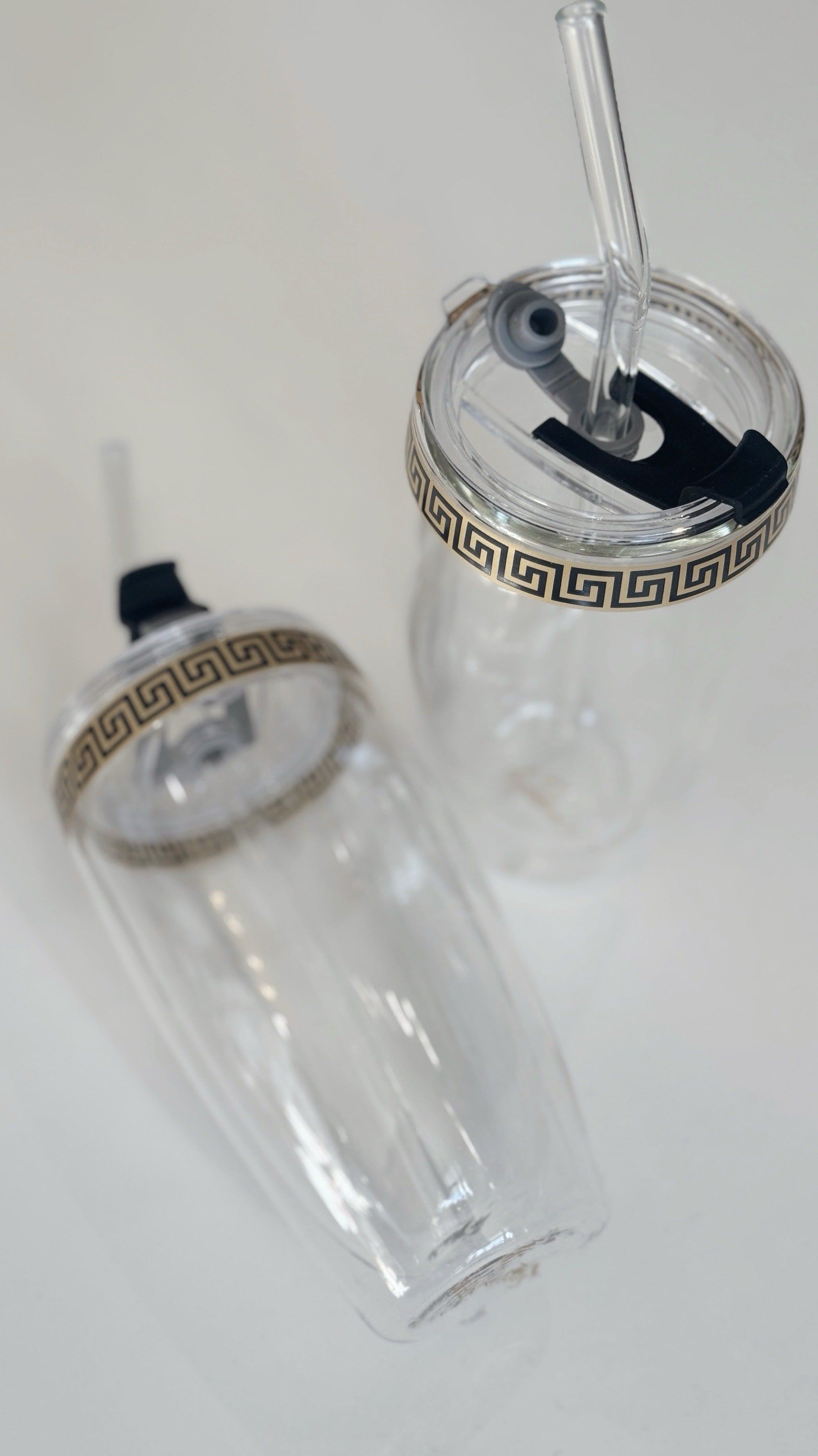 The Hermes -Traveler, a masterpiece designed for the modern adventurer. Double walled high borosillicate glass traveler. Complete with a stylish sleek touch - gold/black Greek key pattern.