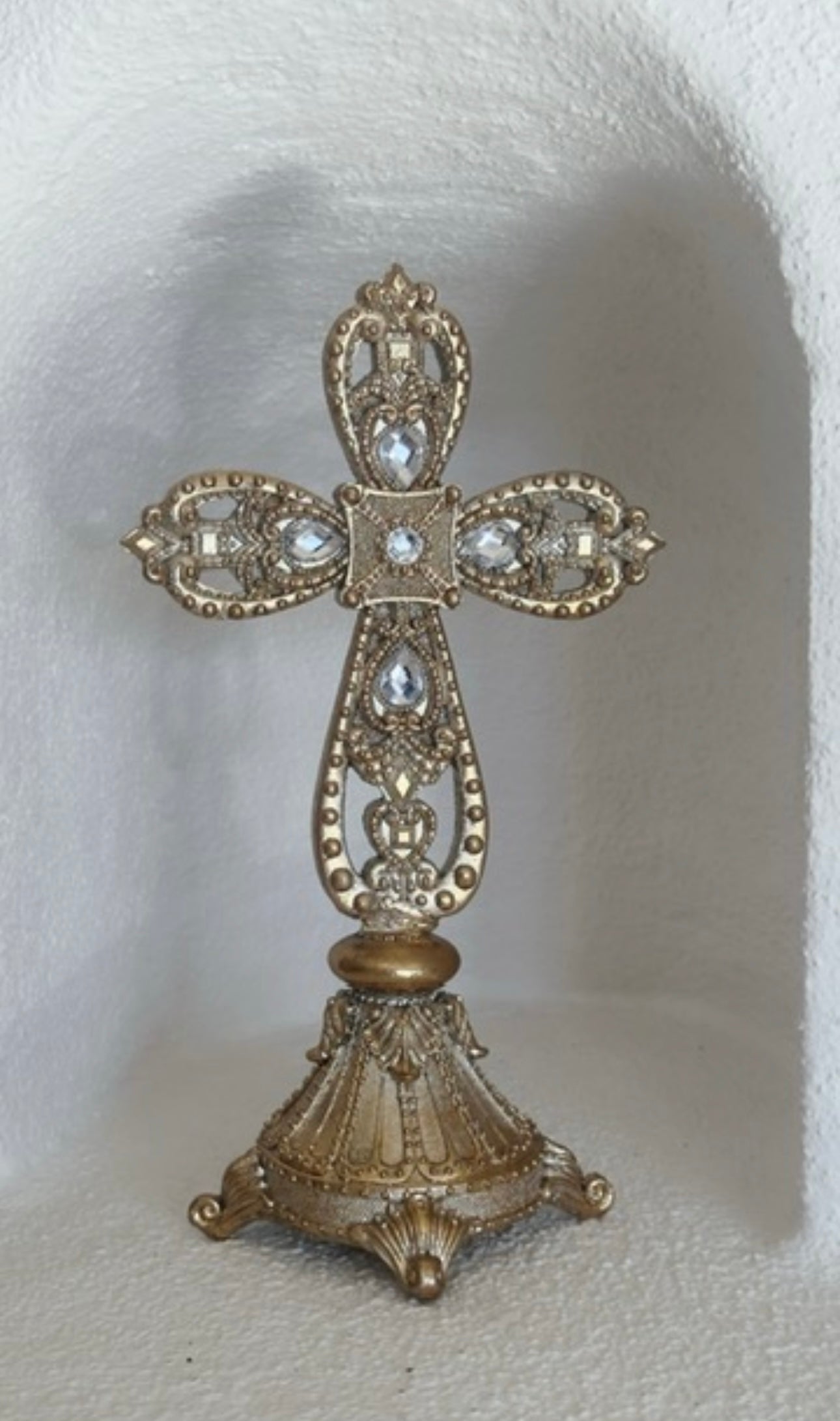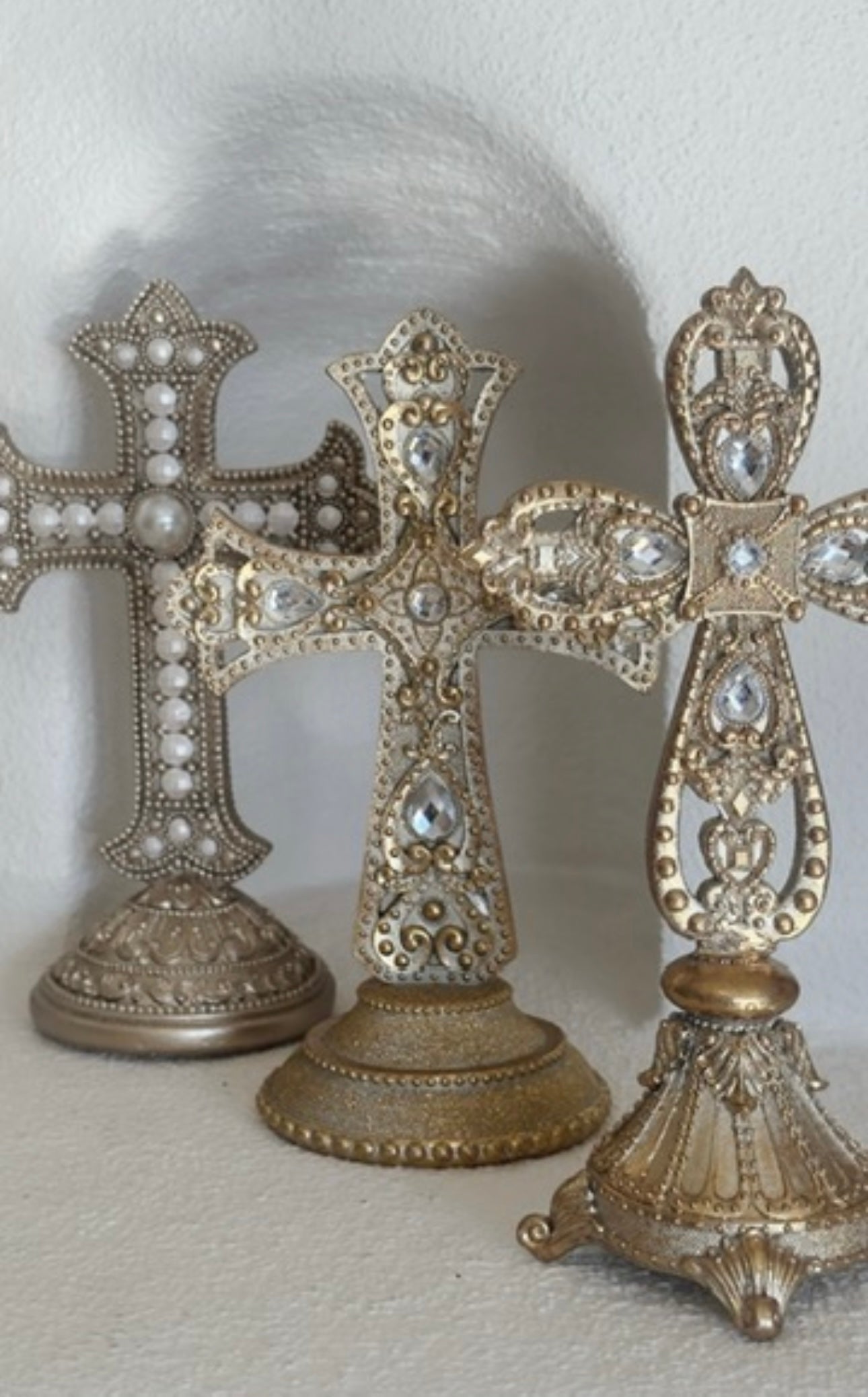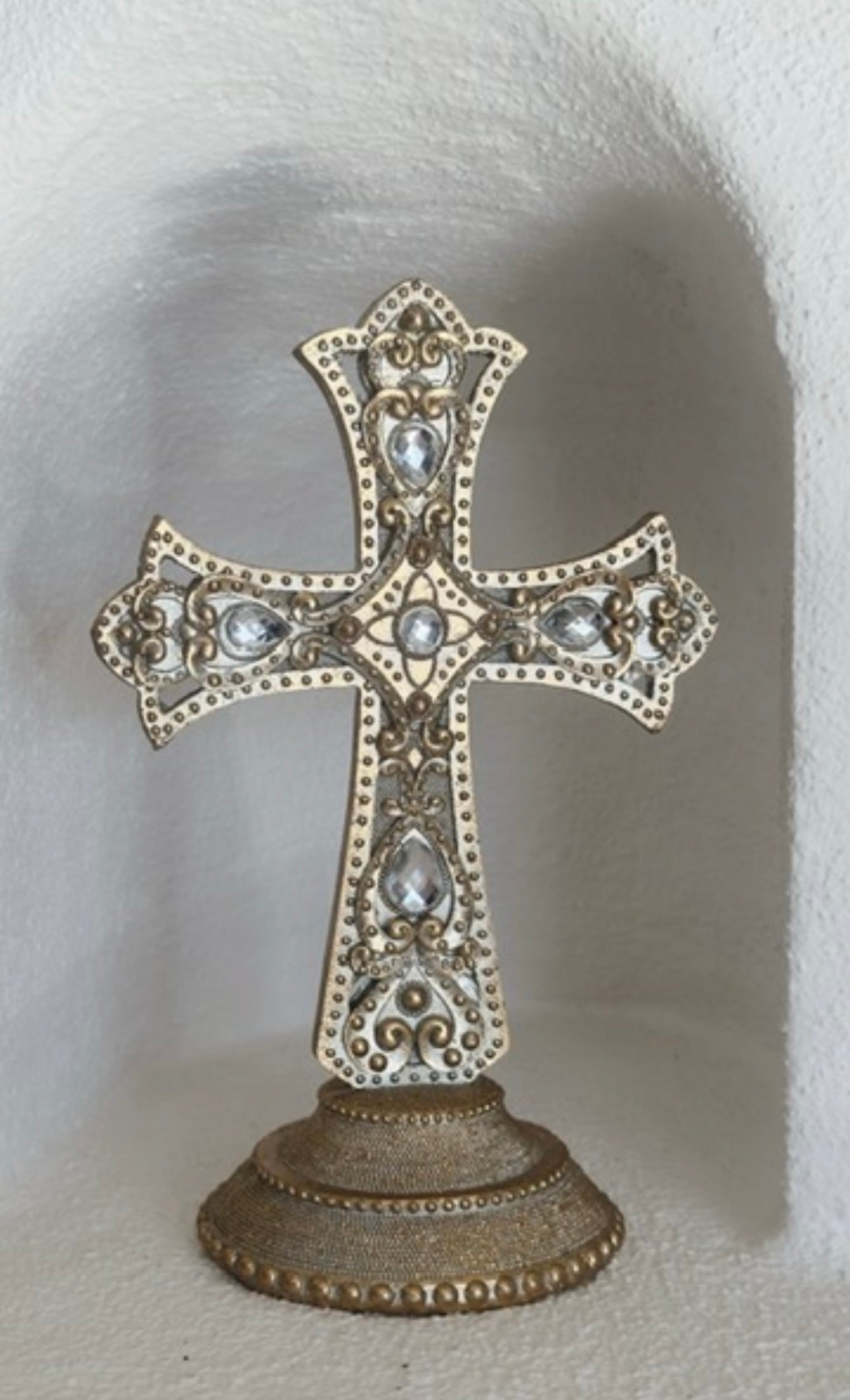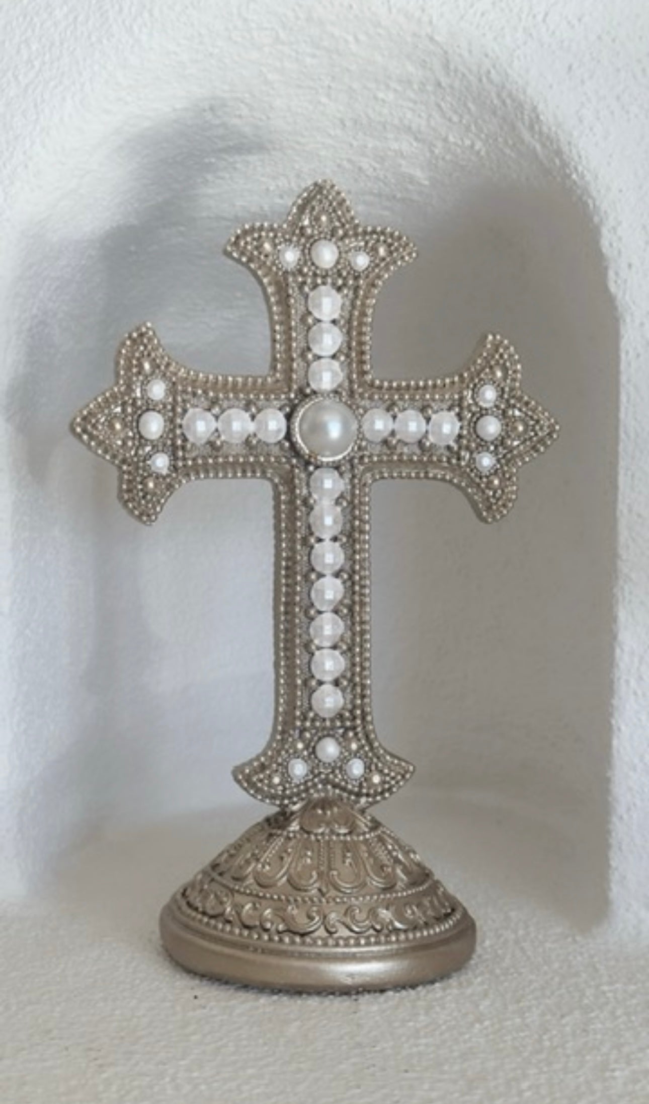 Designed with ornate metalwork and set upon a sturdy, sculptural base, these crosses are perfect for display on a home altar, prayer corner, or as a meaningful centrepiece within your space. Their antique gold and pearl tones evoke a sense of old-world reverence while remaining timeless and elegant.