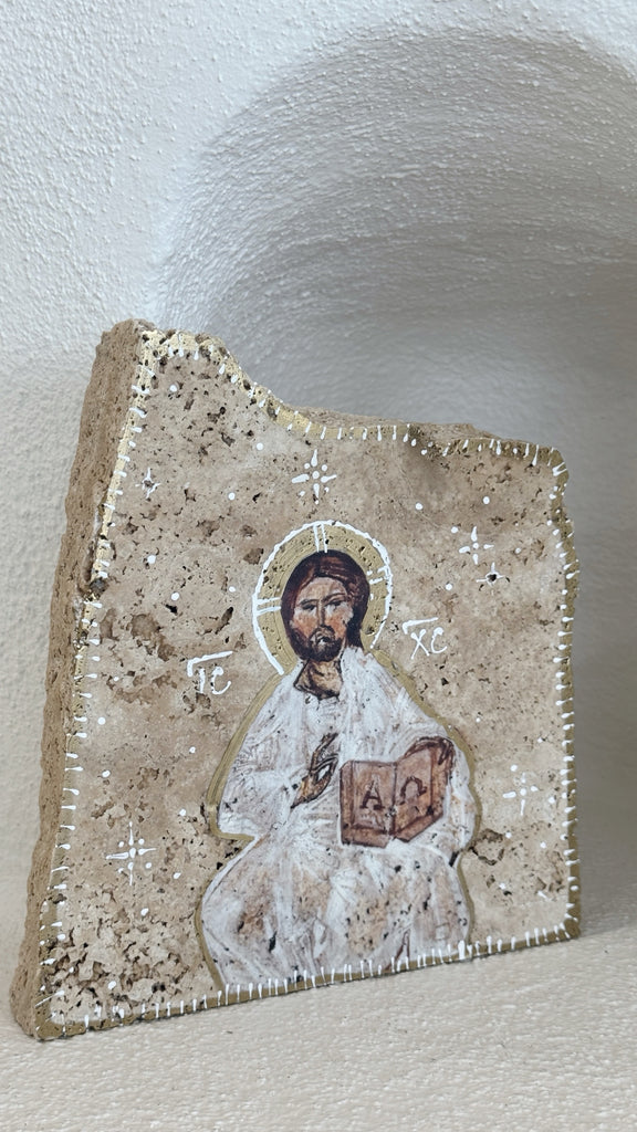 18kt GOLD GUILDED JESUS CHRIST - TRAVERTINE ICON