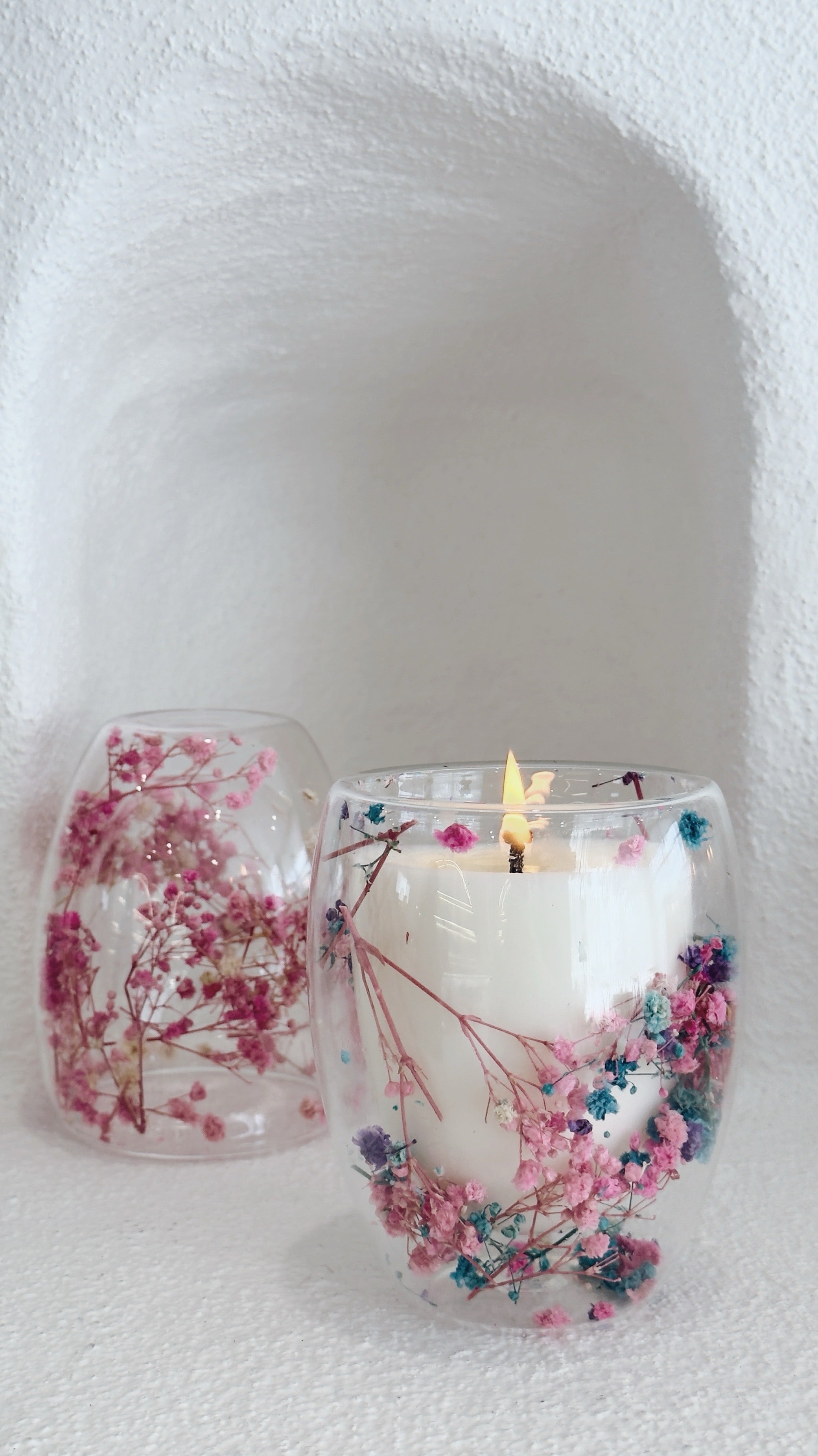 Double walled vessel, elegantly filled with vibrant coloured dried flowers – blending functionality with decorative charm.